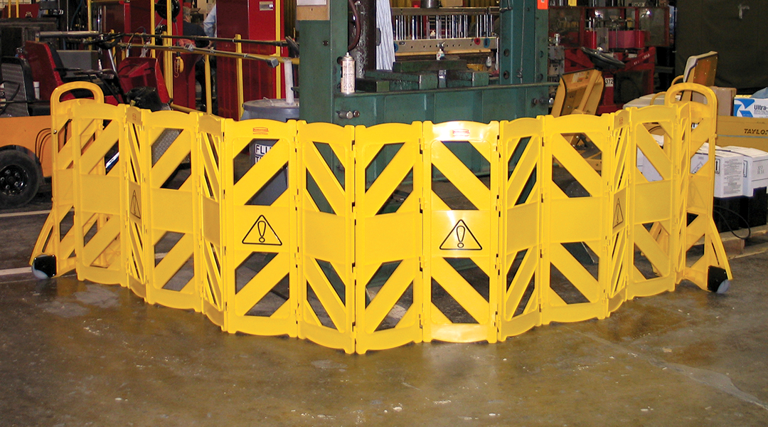 Easy to use, easy to see, easy to move, and easy to store mobile barrier uses articulating panels to extend to 13 feet long. It can be used straight, curved or circular. ANSI/OSHA-compliant colors.