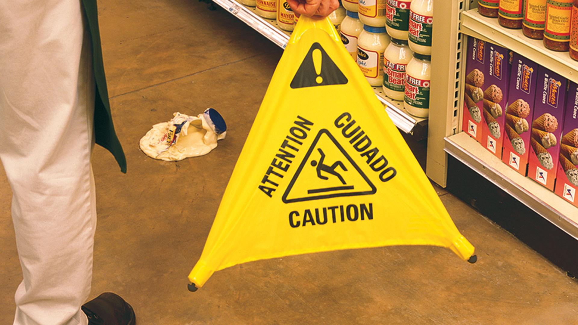 Placing caution signs in highly visible areas to alert patrons and staff of hazard is key to preventing slips, trips and falls.